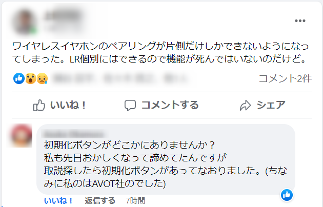親機側をリセットしたり、登録を削除したりしたのですが現象は一向に変化なし。また、Anker Soundcore Liberty Air 2-LにペアリングをするとL側のみから音声が出力されました。どうも、L側・R側単体ではうまく動いているのですが、L-Rの接続がうまくいかないという状況。そろそろ壊れちゃったかなかなと思いSNSに書き込んでみたところ以下のようなコメントを頂きました。(Okamuraさん、ありがとうございます!)