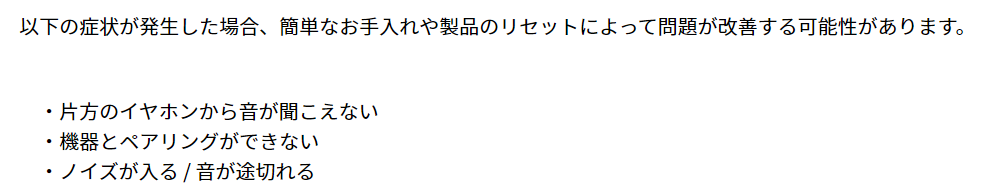 自分は「全く音が出ない」とか「ペアリングデバイスがみあたらない」ときに行うのかと思っていたので、こういうときも初期化の対象になる状況なのか予想していませんでした。
