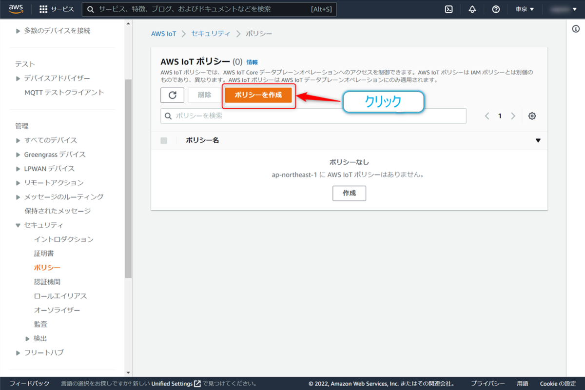 クリックすると【AWS IoTポリシー】設定画面になるので、その中にある【ポリシー作成】ボタンをクリックします。(ちなみに下にある【作成】ボタンでもポリシーの作成はできます)
