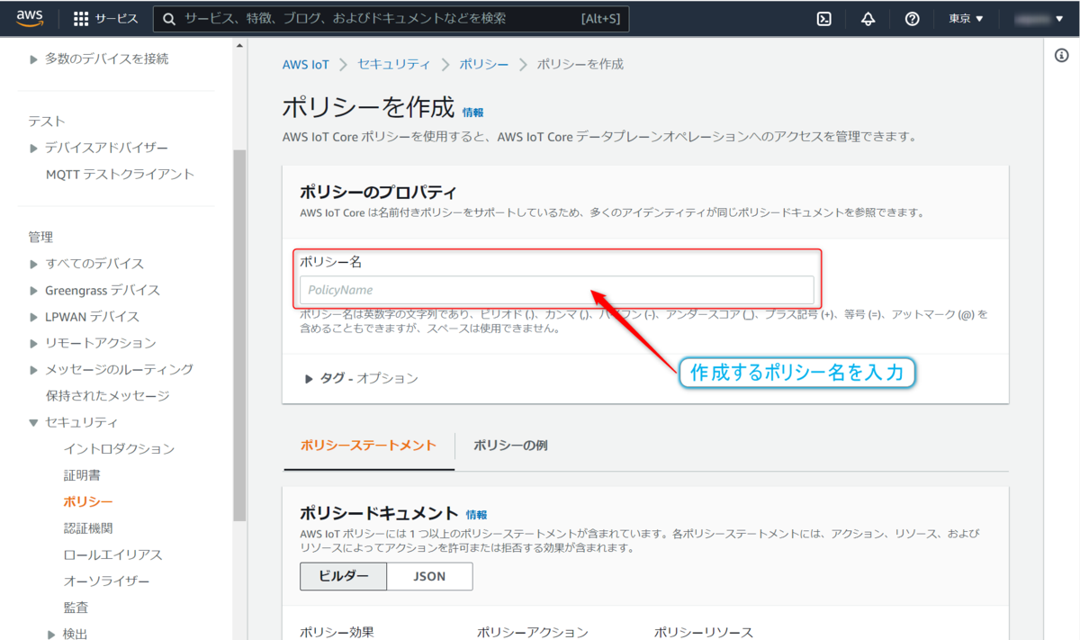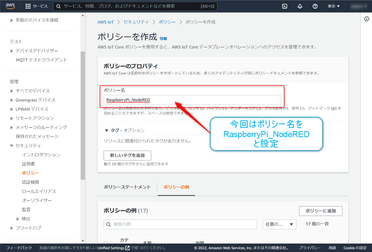 【ポリシー名】の入力ボックスに、今回はRaspberryPi_NodeREDと入力することにします。このポリシー名に使用できる文字種は限られているので注意です。