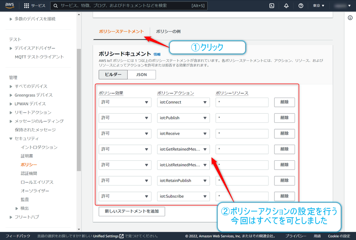 前半となるAWS IoT Coreの設定が完了まできました。参考にしたサイトの情報からUIの見え方が結構変わっていたので、やることはわかるんですがかなり苦労した印象です。一番大きな違いだったのは、ポリシーステートメントの設定を大枠の設定ではなく、ひとつひとつ設定が必要だった点だったかなと思います。色々種類はありますが、UIは刻一刻と変化していくのでそれに対応するのも大変ですよね~と思っちゃうのでした。参考になる資料を見つけたらすぐにやってみるのがおすすめですよね。