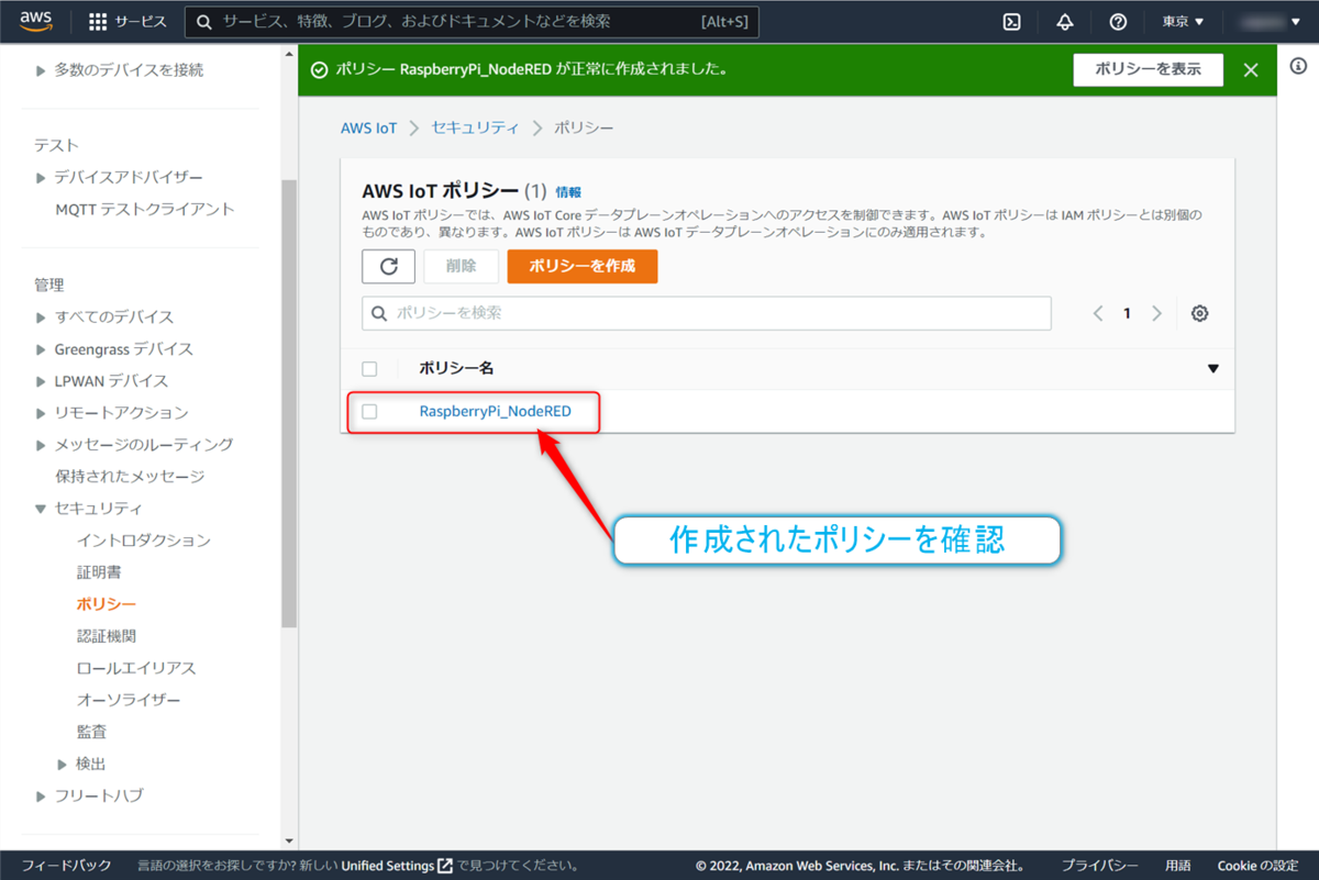 すると、【AWS IoT ポリシー】画面に先程作成したポリシー(RaspberryPi_NodeRED)が表示されます。