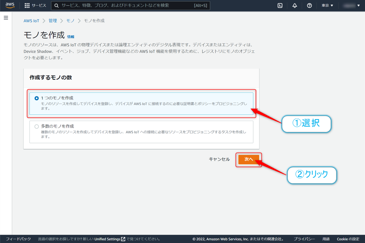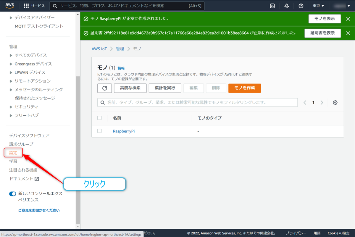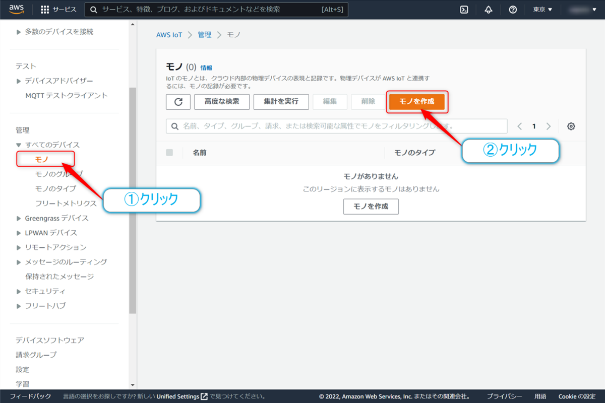 続いてはモノの作成となります。ここでいうモノとは物理的なモノではなく接続するデバイスの設定を作ることになります。