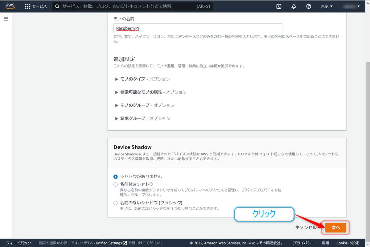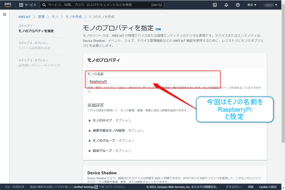 続いてはステップ1の【モノのプロパティを指定】画面になります。今回は作成するモノの名前をRaspberryPiとしておきます。入力ボックスに入力しておきます。