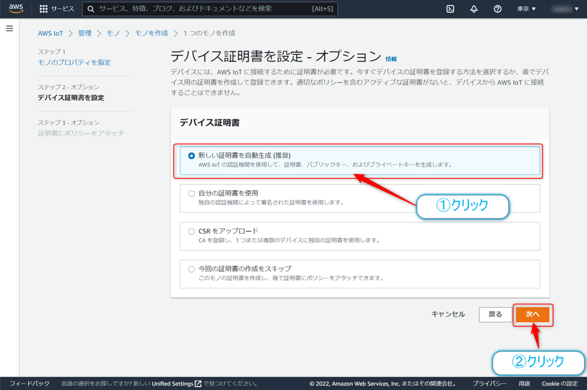 続いてステップ2の【デバイスの証明書を設定】画面となります。今回はこのモノに新しい証明書を作成して設定するので、【新しい証明書を自動生成(推奨)】にラジオボタンを設定して、【次へ】ボタンをクリックします。