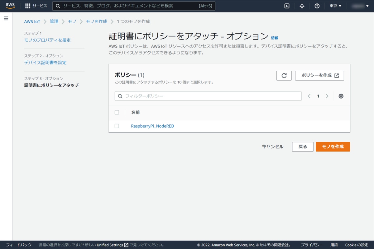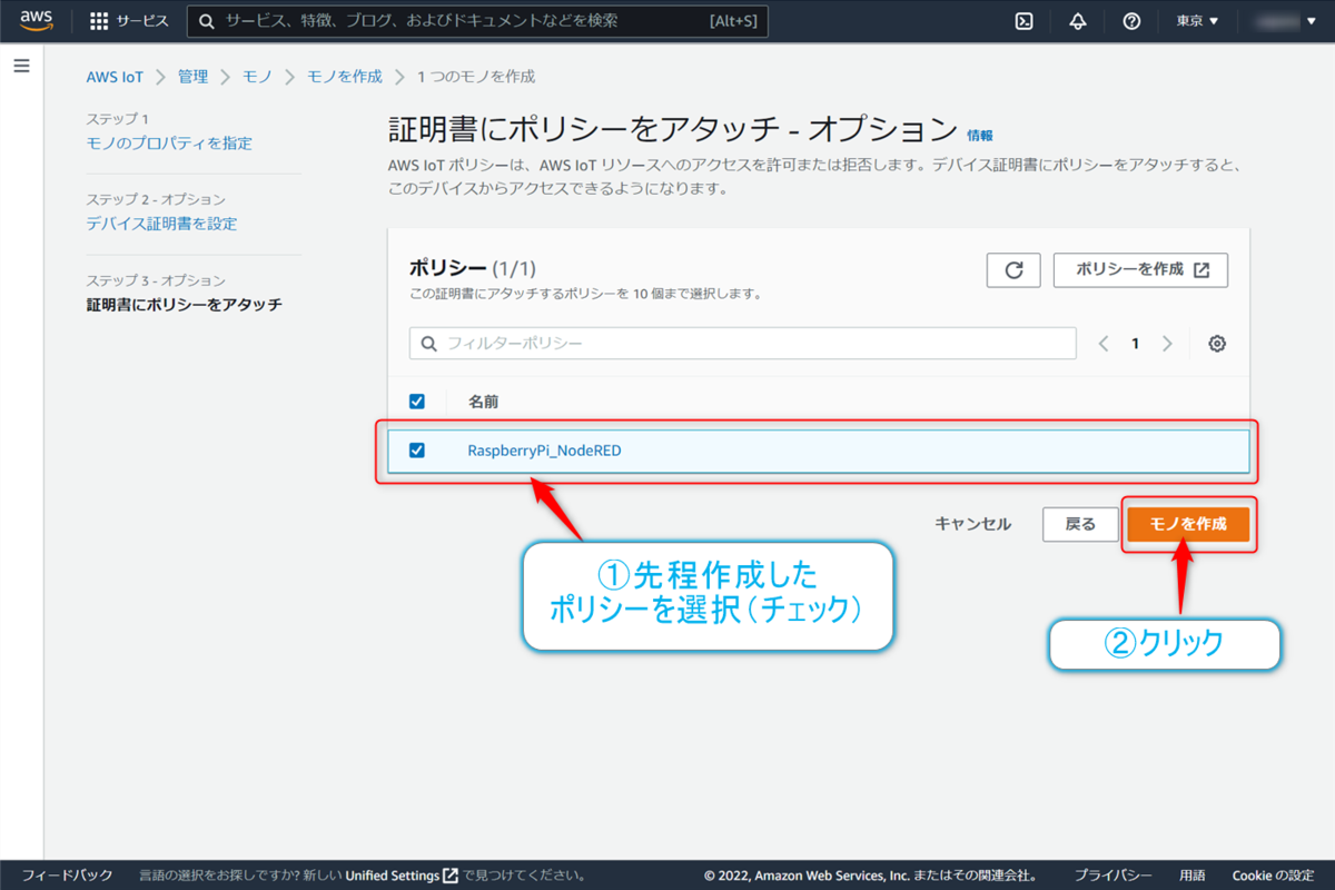 ステップ3では、【証明書にポリシーをアタッチ】画面となります。先ほど作成したポリシーを設定することになります。画面にはすでに作成したポリシーが表示されていると思うので、今回は先程作成したRaspberryPi_NodeREDのポリシーにチェックをいれて、【モノを作成】ボタンをクリックします。