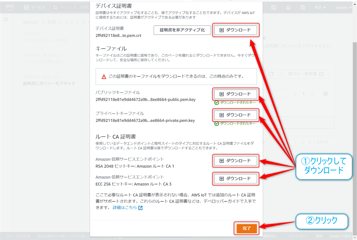 すると、このモノに関係される証明書関連のファイルをダウンロードするダイアログが表示されるので、全て【ダウンロード】ボタンをクリックして保存しておきます。保存が完了したら【完了】ボタンをクリックします。