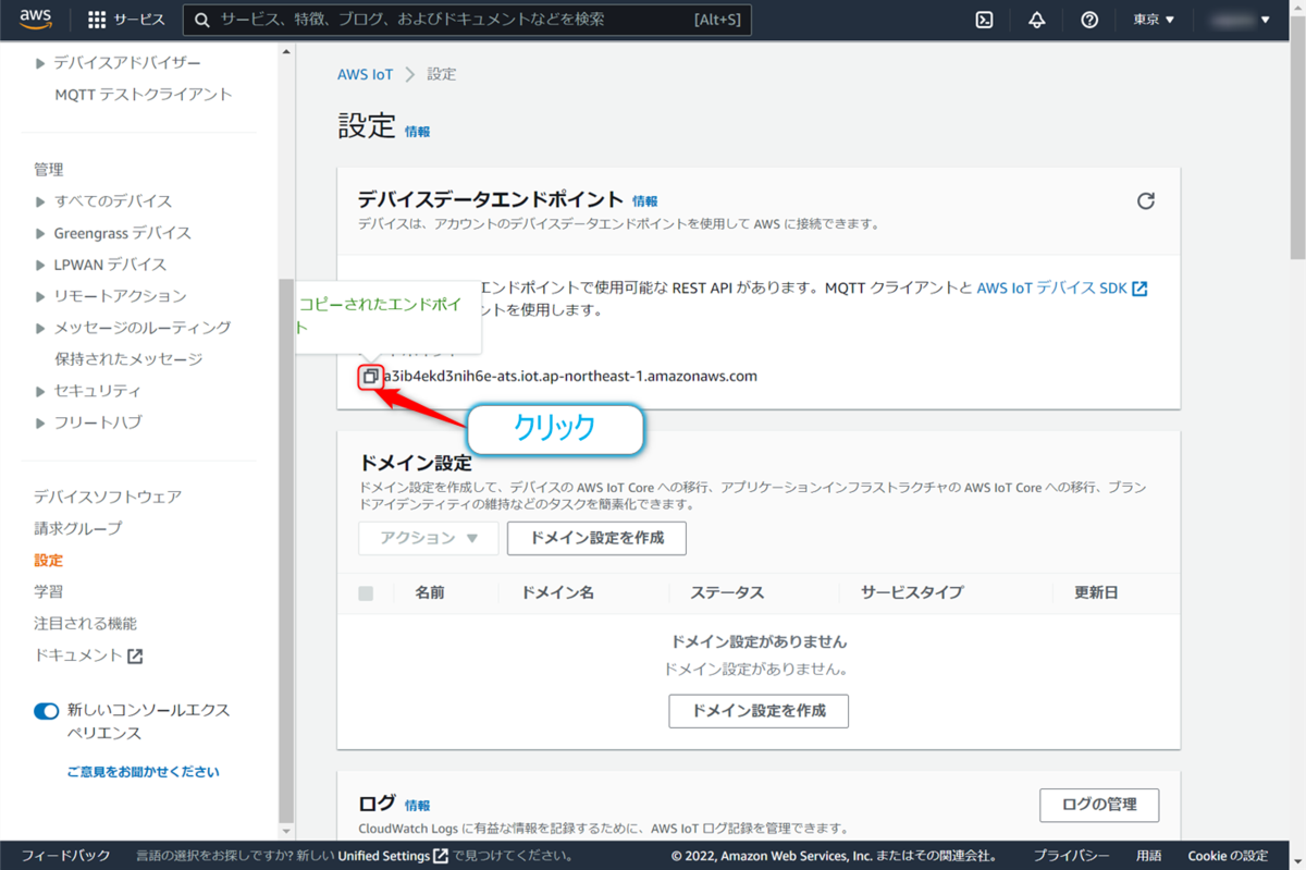 最後にAWS IoT Coreへのエンドポイントを取得します。