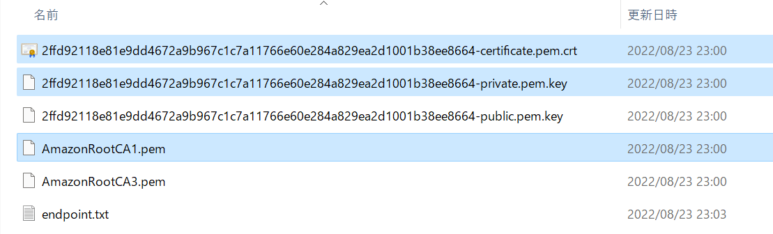 ここまでの手順で証明書、エンドポイントが手元に揃っているかと思います。ファイルとしては以下の様になっていると思います。今回はこの中から青く色を変えたファイルを使用していくことになります。