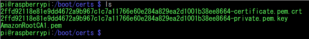 あとは、このファイルをRaspberryPiにコピーしていきます。SDカードでWindows側からも操作ができる/boot/certsというディレクトリを作成して、必要なファイルをコピーすればOKです。sftpなどで転送しても大丈夫です。
