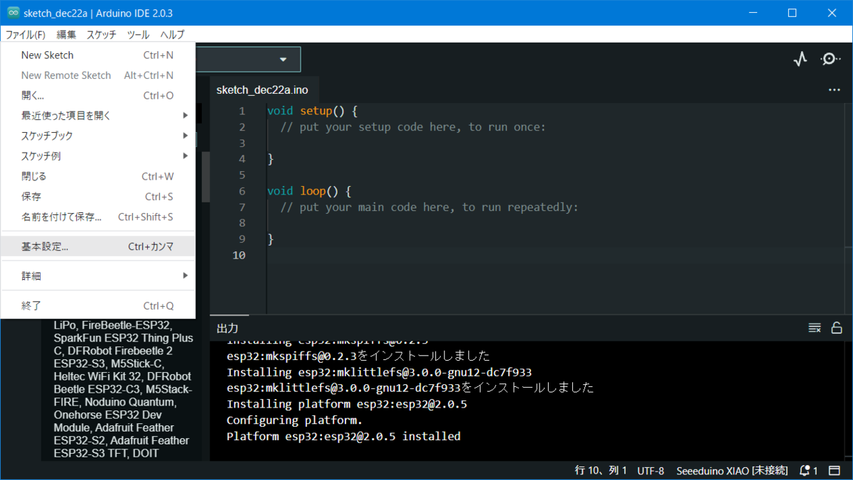 そこでメニューの【ツール】→【ボード】→【esp32】→【XIAO ESP32C3】を選択します。これでボードの認識が正常なXIAO ESP32C3になります。