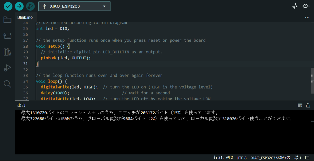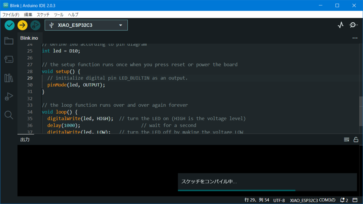 エラーメッセージをみるとLED‗BUILTINがないとのこと、ということは…そうXIAO ESP32C3には本体にテスト用のLEDが存在しないようです。OutピンにLEDをつける必要がありますね。他のXIAOシリーズに比べると初期のテストがちょっと面倒…まあ、LEDをつけるだけにこの機種を選ぶ人なんていないのでいいのかもしれませんけど。