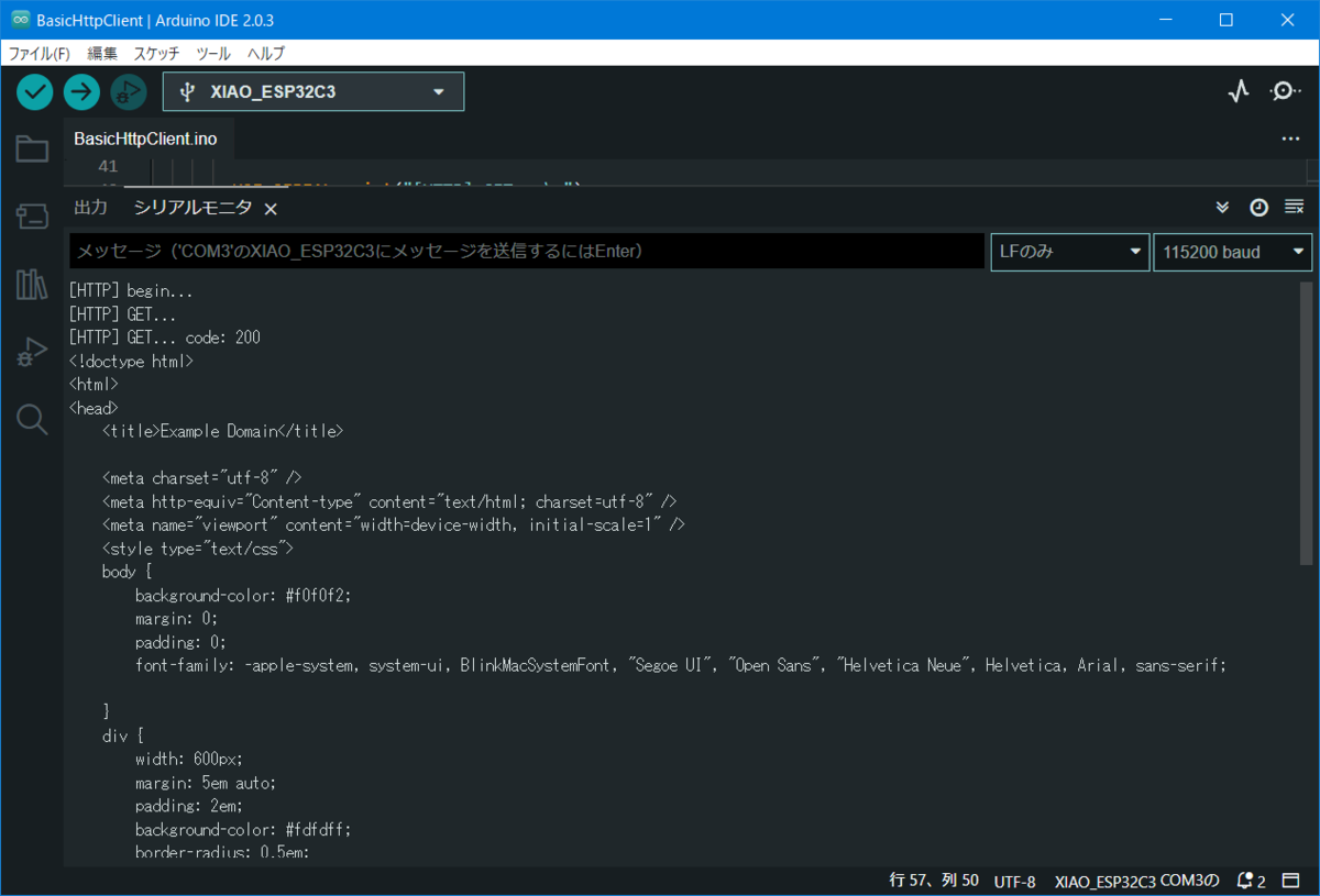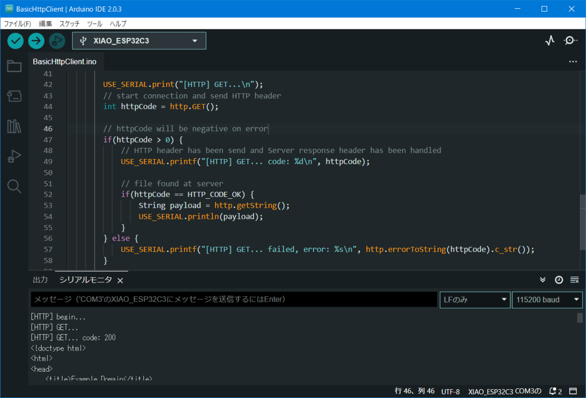 先ほどはSSIDの検出でしたが、次はHTTP通信を行ってみたいと思います。こちらはArduino IDEのスケッチ例にあるbasicHTTPClient.inoを使用しますが、一部HTTPSの残骸等があるのでそれは削除しました。