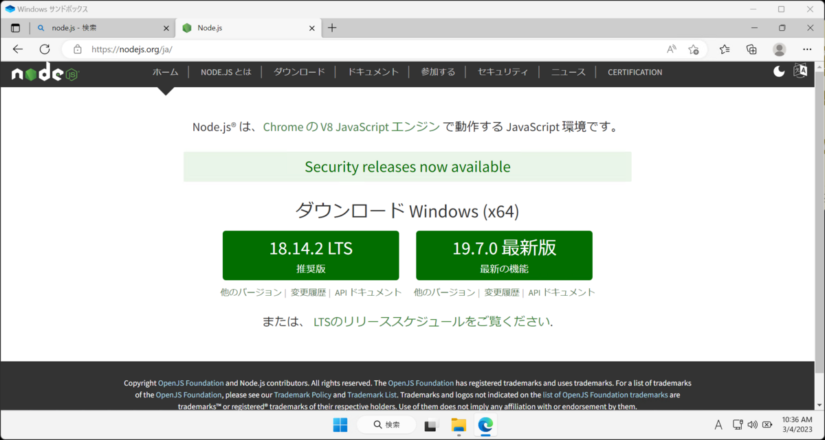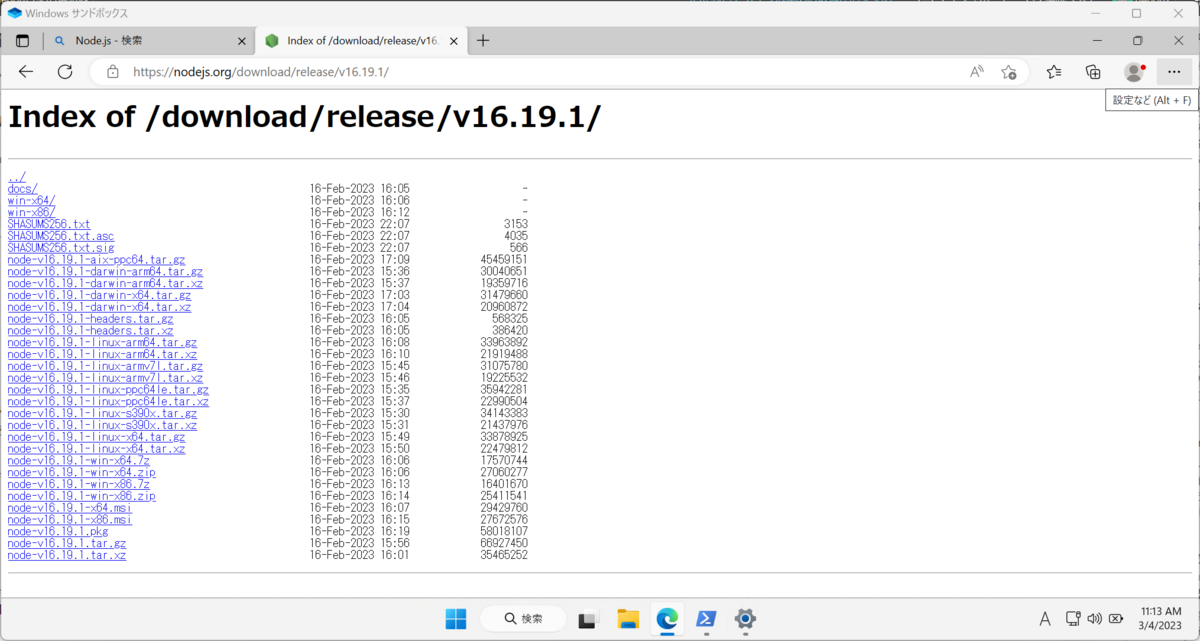 現在はNode.js v18.14.2がインストールされているので、これの一つ前のLTSバージョン(Node.js 16.19.1)に変更します。以下のURLから検索するとNode.jsの過去リリースを使用する事ができます。