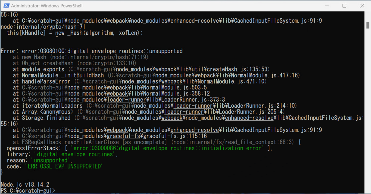 Node.jsのバージョンダウンが終了したら再度以下を実行して起動を行います。