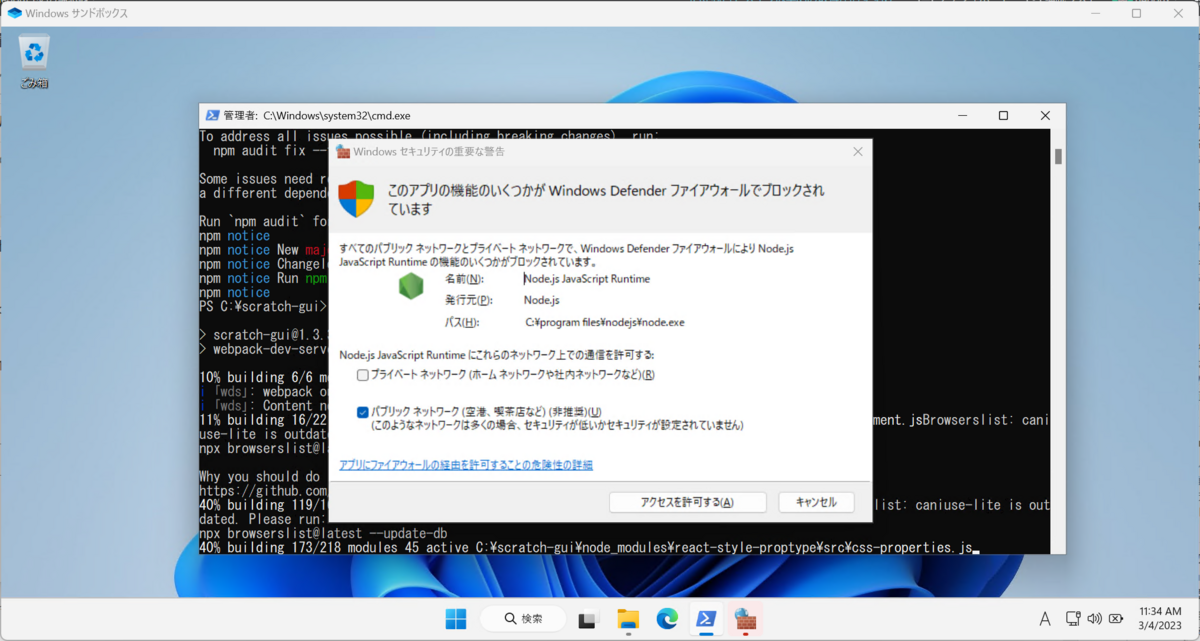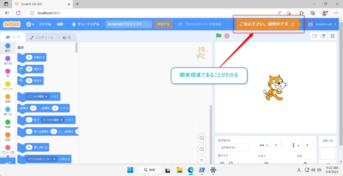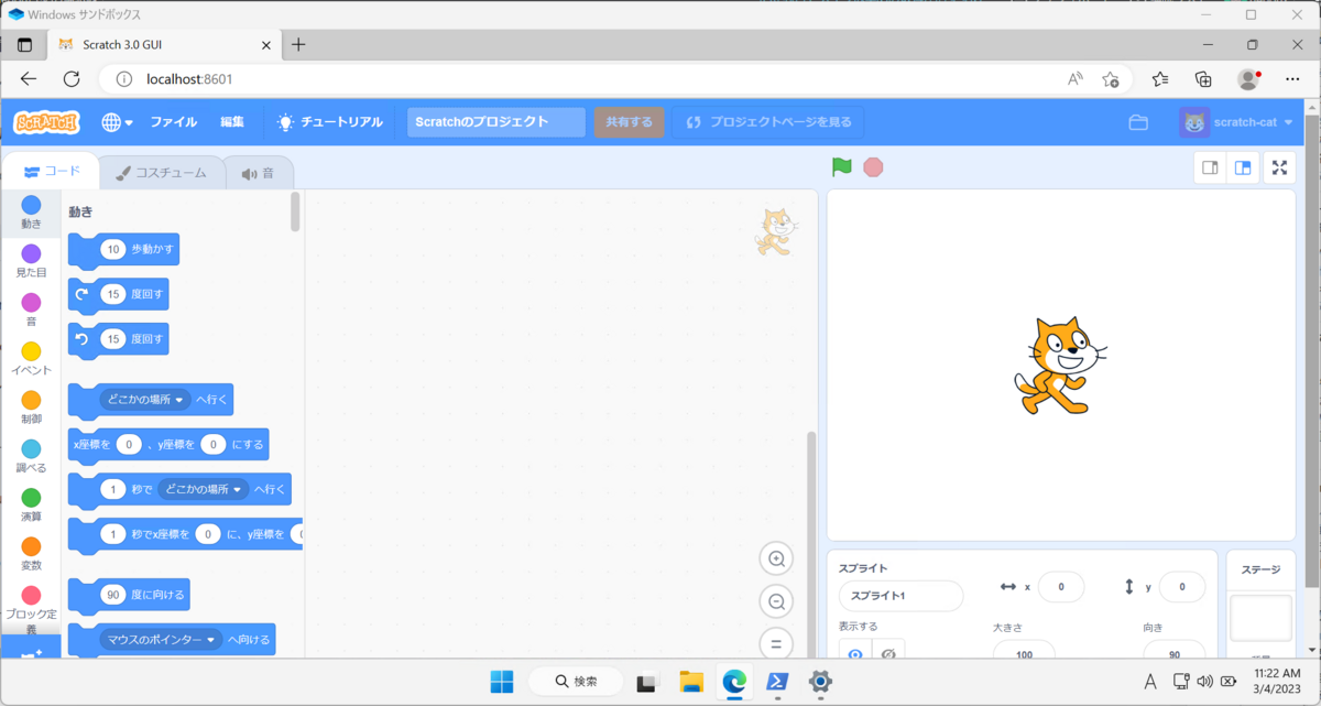 今回使用しているscratch-guiはリポジトリ名にはguiと含まれているのですが実際にはサーバープロセスになるので起動によってブラウザが立ち上がってくることはありません。ブラウザを別途起動してURLを開く必要があります。Windows Sandbox内の環境であればhttp://localhost:8601を開くことになります。