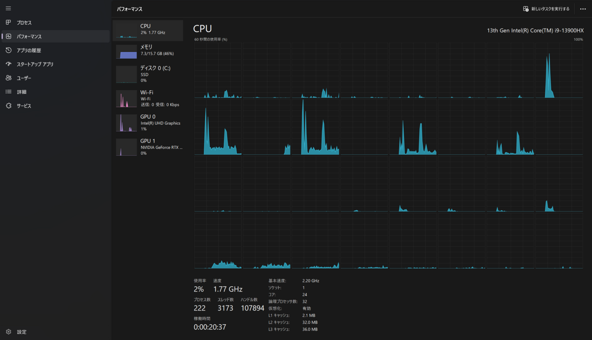まずはCPU情報。CPUは先程のスペック通りCore i9-13900HX