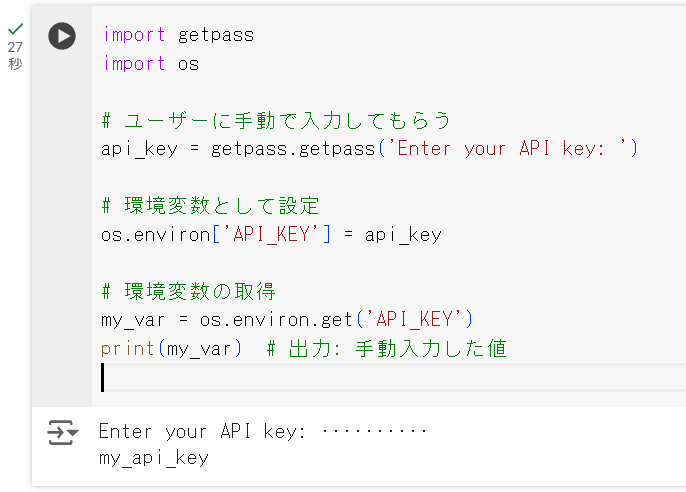 import getpass import os # ユーザーに手動で入力してもらう api_key = getpass.getpass('Enter your API key: ') # 環境変数として設定 os.environ['API_KEY'] = api_key # 環境変数の取得 my_var = os.environ.get('API_KEY') print(my_var) # 出力: 手動入力した値