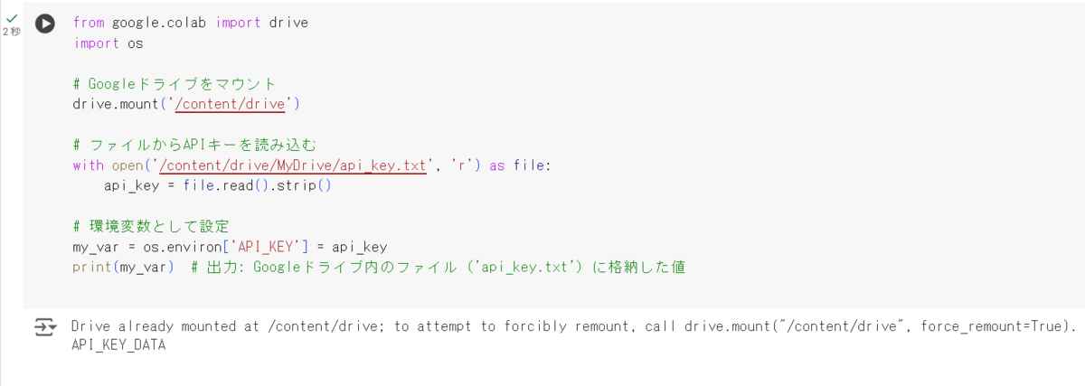 from google.colab import drive import os # Googleドライブをマウント drive.mount('/content/drive') # ファイルからAPIキーを読み込む with open('/content/drive/MyDrive/api_key.txt', 'r') as file: api_key = file.read().strip() # 環境変数として設定 my_var = os.environ['API_KEY'] = api_key print(my_var) # 出力: Googleドライブ内のファイル('api_key.txt')に格納した値