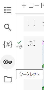 シークレット機能を使用するにはColabの左サイドにある【鍵アイコン】をクリックします。