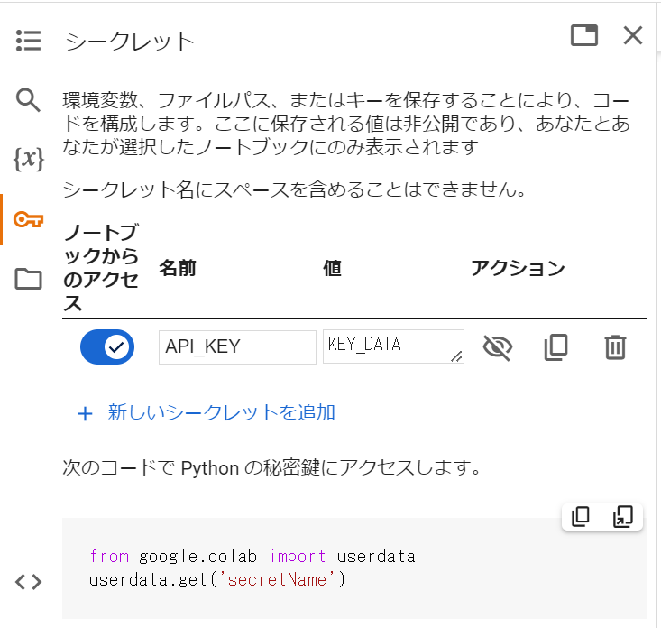 from google.colab import userdata my_var = userdata.get('API_KEY') print(my_var) # 出力: シークレット機能で設定をした値