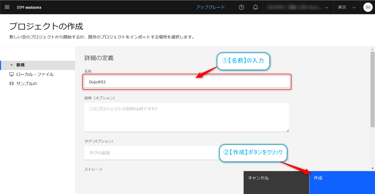 プロジェクトの作成画面にきたら、【名前】のフィールドに入力し、【作成】ボタンをクリックします。今回私はDojo#03