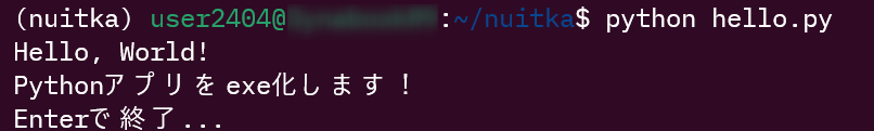 # 実行ファイル化 $ nuitka --onefile hello.py # 実行ファイルの実行 ./hello.bin